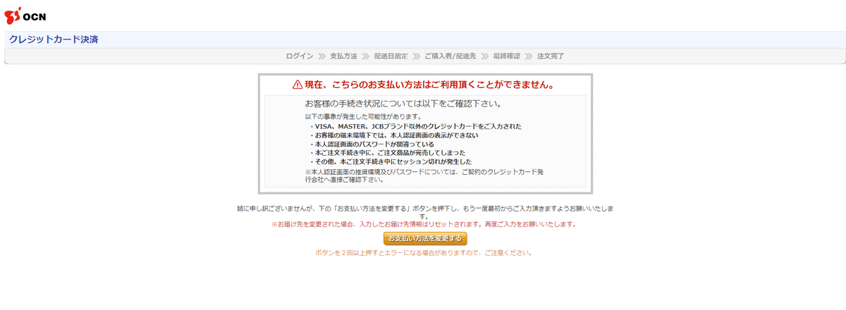 購入ボタンを押した後、「現在、こちらのお支払い方法はご利用頂くことができません。」と表示されて、購入手続きが失敗します。